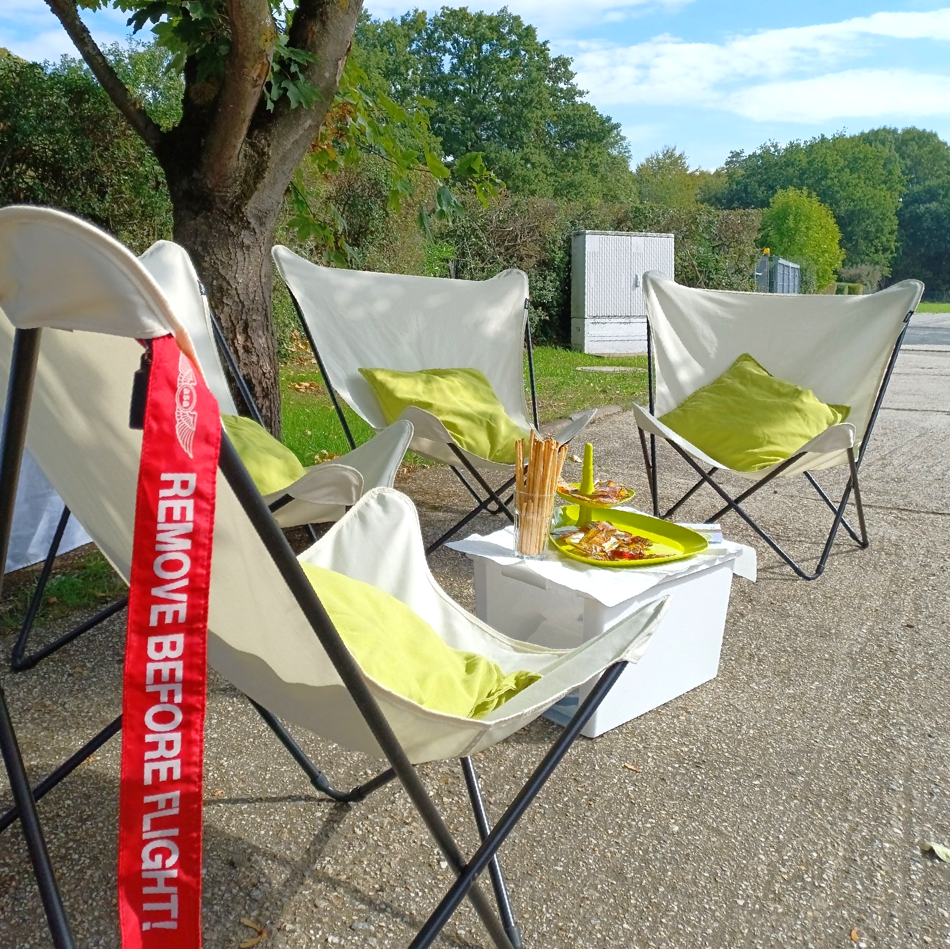 Bleiben Sie gerne auch nach Ihrem Flug noch zum Verweilen und Austauschen der erlebten Flugeindrücke in unserer kleinen, extra für Sie eingerichteten "Outdoorlounge" und entspannen Sie in unseren gemütlichen "butterfly chairs" bei einem kühlen Getränk oder einem frischen heißen Kaffee.